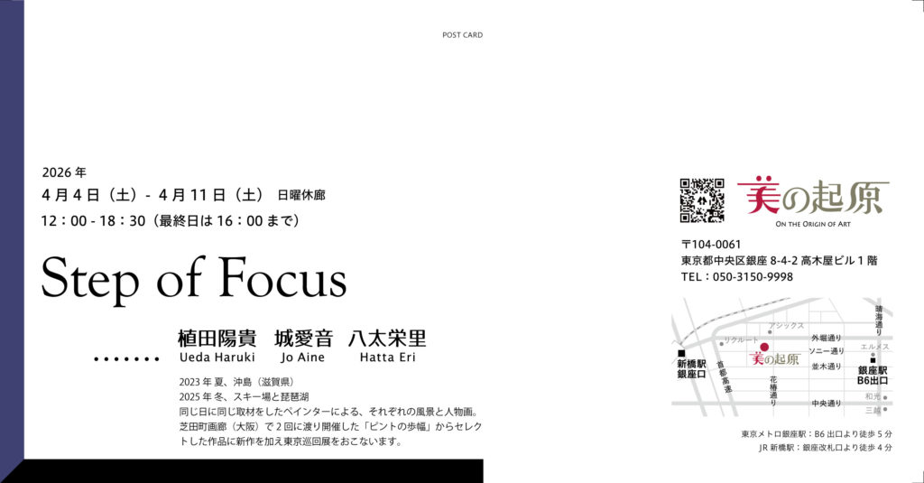 4月4日より、東京都中央区銀座の美の起原にて「Step of Focus…..植田陽貴・城愛音・八太栄里」に出展いたします。